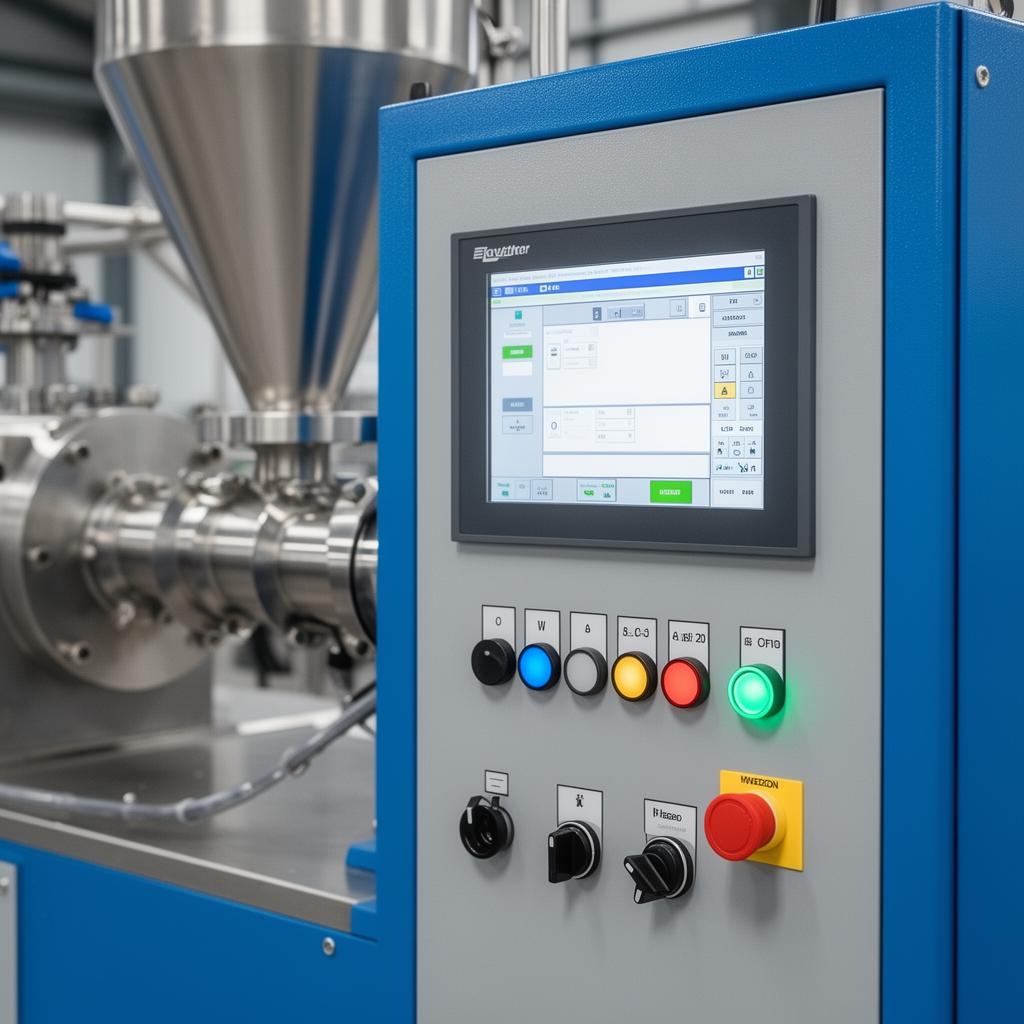 Explore detailed views of our conical twin screw extruder components, controls, and factory installations